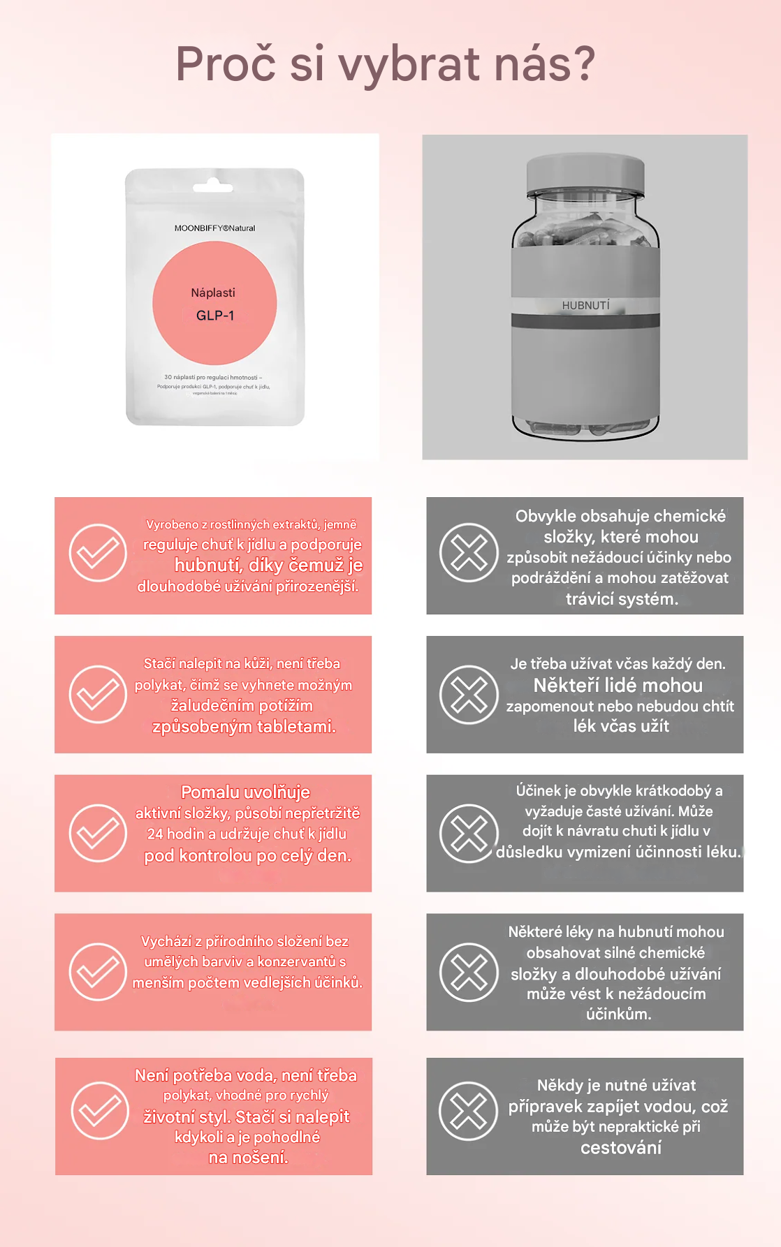 Naše náplasti mají výhodu oproti pilulkám, protože aktivní látky dodávají přímo do krevního oběhu, čímž obcházejí trávicí systém a přinášejí rychlejší a účinnější výsledky.